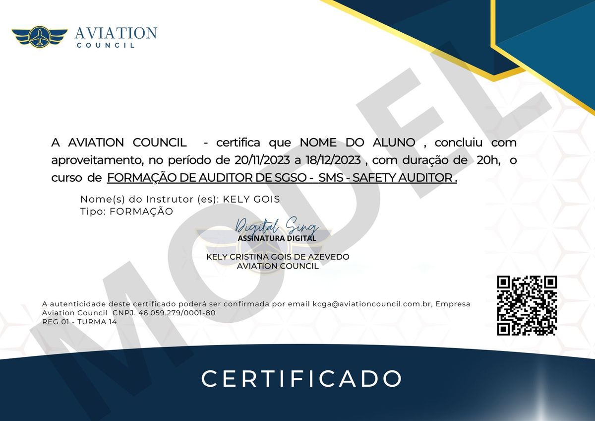 Tenho certificações relevantes, incluindo a de instrutora em SAFETY pela ANAC e a certificação de Auditora Líder IRCA pela SGS e DNV, com especialização em ISO 9001, ISO 31000 e Formação em Sistema Integrado, Projeto e Aviação Civil.